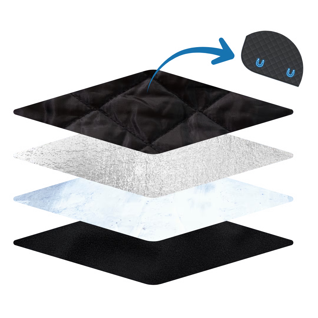 ✓ 4-point magnetic stability system — magnets, mirror straps, door flaps, and wheel hooks keep it locked in place, even in strong winds.